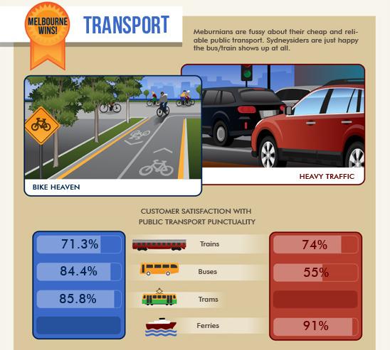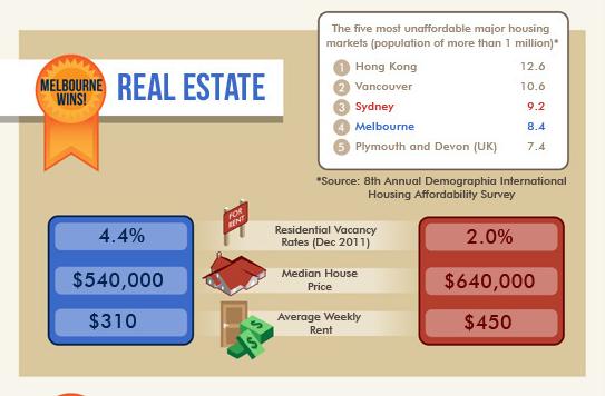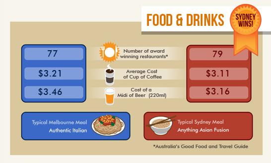 和悉尼比,墨尔本明显较为便宜。比如一个差不多位置的房子,墨尔本30多万澳元,悉尼要50多万澳元,可怜去悉尼的朋友要多奋斗多少年啊。有机构做过调查,墨尔本人更希望住在离市中心较近的地方,以享受生活方式的便利;而悉尼人更喜欢住得远一些。悉尼的小吃店比墨尔本多,Asfield是上海街,可以吃很多正宗的家乡小吃。也有人说墨尔本的中餐馆强过悉尼,但论日韩美食,悉尼略胜墨尔本。墨尔本的咖啡非常出色,令很多悉尼人慕名而来。