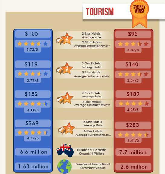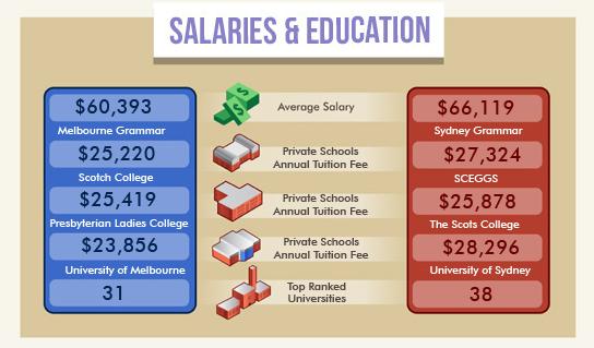 澳洲八大(Group of Eight)在悉尼和墨尔本各有两所(墨尔本:墨尔本大学和莫纳什大学,悉尼:新南威尔士大学和雪梨大学)。悉尼的学校数量是澳洲之最,除了顶级大学外,其他的3、4星级的大学和学院比墨尔本的选择余地大。悉尼就业机会相对于墨尔本较多,大环境而言。工作大概多墨尔本20%左右。