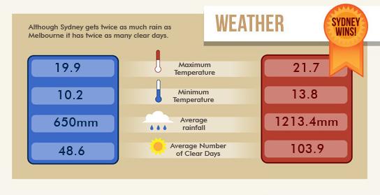 悉尼气候比起墨尔本没那么多变。墨尔本是花园之都,过敏体质容易染上花粉症,这是墨尔本名产。另外墨尔本冬天也冷一些,不过悉尼相对太潮湿,小强特别多。两地的温度在同一天可能是天壤之别。