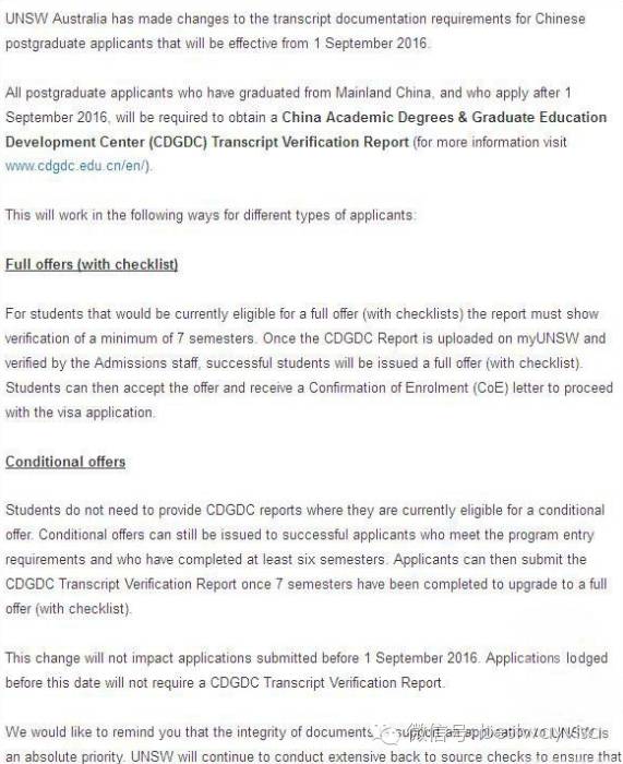 继澳大利亚悉尼大学和昆士兰大学之后,新南威尔士大学也宣布,自2016年9月1日起,所有持中国大陆本科学位的研究生课程申请者需要提供由教育部学位与研究生教育发展中心出具的成绩单认证报告(下简称“成绩单清华认证报告”)。9月1日前递交申请的不受新要求影响。