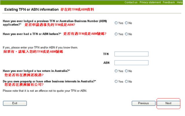 步骤五:是否有存在的TFN或ABN资料?如果没有,请选NO,确认回答所有问题后请按NEXT