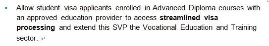 SVP可以解释为“简化签证审理计划”。顾名思义,申请该计划内课程的学生将在签证申请接受简化审理,在申请签证时不需要提供有历史存期的担保金证明和雅思成绩。 但是,这并不意味着移民局放松了对学生资金、语言能力的要求,而是移民局把这部分审核转移给学校,由学生申请的学校与学校认可的留学服务机构一道来审核学生的资金和语言是否符合赴澳就读的要求。 部分学校在申请时还是需要学生提供雅思成绩,一些学校还要求学生在颁发COE(录取确认信)之前提供存款证明。
